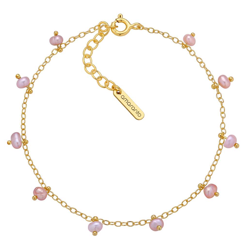 Złota bransoletka Pink Pearl olśniewa naturalnymi różowymi perłami w pudrowym odcieniu, zamocowanymi na grubszym łańcuszku niż w bransoletkach Dotty, idealnym do większych i cięższych pereł. W kolekcji dostępne są również inne warianty bransoletki z perłami, w tym modele wykonane ze srebra.