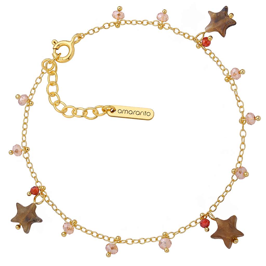 Złota bransoletka z szampańskimi i pomarańczowymi cyrkoniami oraz gwiazdkami z brązowego labradorytu. Subtelne cyrkonie dodają blasku, a labradoryt w ciepłym, brązowym odcieniu emanuje tajemniczym urokiem. Labradoryt to kamień ochrony i wewnętrznej siły, wspierający równowagę i spokój. Złoty łańcuszek podkreśla delikatność kompozycji i kobiecą elegancję. Biżuteria pełna znaczenia – łączy energię, harmonię i wyjątkowy styl.