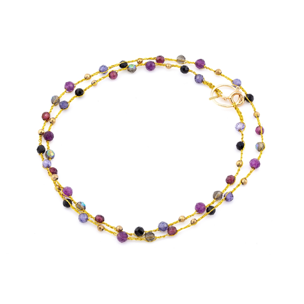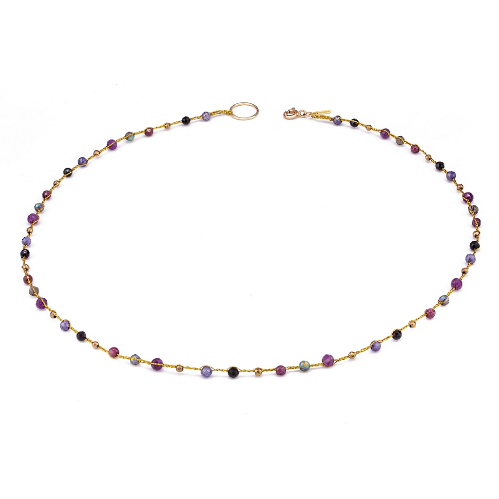 Naszyjnik Aura Ametyst to wyjątkowa kompozycja subtelności i blasku. Misternie zaplatane złote nici oplatają drobne, fasetowane kamienie 2–3 mm: ametyst, czarny turmalin, granat, złoty hematyt oraz opalizującą cyrkonię. Każdy z nich odbija światło pod innym kątem, tworząc efekt delikatnej, wielobarwnej aury tuż pod szyją.